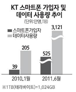 인위적인 전송속도 제한 논란이 불거지고 있는 이유는 스마트폰 가입자들의 데이터 사용량이 감당하기 버거울 정도로 늘어나고 있기 때문이다. 실제로 작년 1월 39만명에 불과했던 KT 스마트폰 가입자는 올해 6월 525만명으로 늘어났다. 같은 기간 데이터 사용량도 205TB(테라바이트)에서 3,121TB로 급증했다. 특히 상위 10%의 가입자가 90%의 데이터를 사용하는 등 가입자 간 편차도 극심하다. 지난달 KT의 한 가입자는 500GB의 데이터를 사용하기도 했다. 일반 요금제로 환산하면 2,600여만원에 해당하는 금액이다.