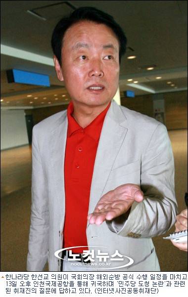 한 의원은 13일 장기간의 유럽 순방을 마치고 귀국하는 자리에서 "국회법에 따르면 국회 내 발언은 면책특권에 해당된다"며 경찰의 소환 조사에 응하지 않겠다는 뜻을 분명히 했다.