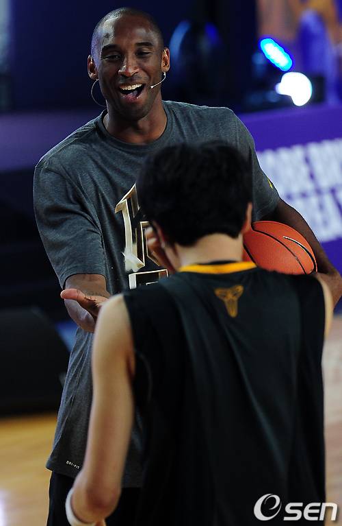 코비 브라이언트가 농구 클리닉중 꿈나무에게 칭찬을 하고 있다. / rumi@osen.co.kr