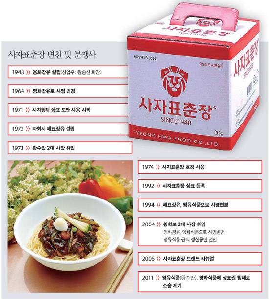 자장의 원료인 춘장의 대표 브랜드인 '사자표 춘장'의 소유권을 두고 부자(父子)간 법정 다툼이 벌어지고 있다.