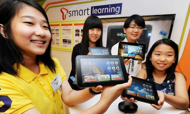 SK텔레콤은 18일 서울 워커힐호텔에서 교육 플랫폼 'T스마트러닝' 서비스 출범 행사를 개최했다. 참가 학생들이 T스마트러닝 콘텐츠를 살펴보고 있다.
