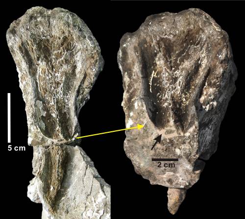 The team speculated that the teeth-marks were left by a carnivorous dinosaur while it was scavenging the body of the herbivorous dinosaur.