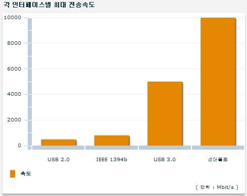 그렇다면 위 세 가지 인터페이스 중 가장 빠른 인터페이스는 무엇일까? USB 2.0이 480Mbps, USB 3.0이 5Gbps, 선더볼트가 10Gbps, IEEE 1394b가 800Mbps다. 그래프로 표시해 보면 이런 차이가 더 확연히 드러난다.