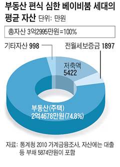 보고서는 베이비붐 세대를 1955~1963년생, 즉 우리 나이로 49~57세로 작년부터 은퇴를 시작한 세대로 규정했다. 보고서에 따르면 이들 베이비붐 세대의 평균 보유 자산은 3억2995만원인데, 이 중 74.8%에 달하는 2억4678만원이 주택 등 부동산이다. 이는 통계청의 2010년 가계 금융조사 결과에서 45~55세 연령층의 평균 자산 보유현황을 평균해 구한 수치다.