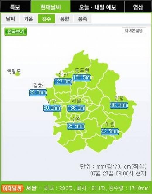 한편 기상청은 서울 경기도 및 강원중북부, 경남남해안에 호우특보를 발효한 상태다. 또 중부지방에 내리는 비가 29일까지 이어지면서 최대 250mm 이상을 기록할 것이라고 예측했다.