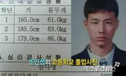 공개된 사진에는 생활기록부로 조인성의 학창시절의 모습과 신체발달상황이 기록되어있었다. 이 생활기록부에는 1학년 때 185cm, 2학년 185.5cm, 3학년 179cm로 기록돼있다. 3학년때 키가 6.5cm 줄어들어 궁금증을 불러일으키고 있다.
