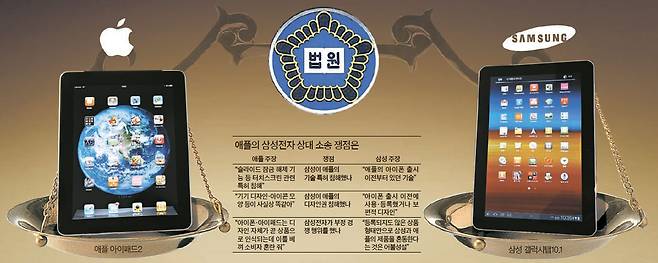 서울중앙지법 민사11부(부장 강영수)는 12일 애플코리아가 "갤럭시S2·갤럭시탭 등이 애플의 특허권을 침해했기 때문에 생산·판매를 금지하고 완·반제품을 파기해야 한다"며 삼성전자를 상대로 낸 소송의 첫 준비재판을 열었다. 재판부는 지난달 1일에는 삼성전자가 애플을 상대로 낸 소송의 첫 준비재판을 열었다. <본지 7월 2일자 18면 >