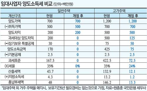 원종훈 국민은행 세무사는 "앞으로 임대주택 한 채만 있어도 임대사업자가 될 수 있고 거주 주택에는 양도세 비과세 혜택을 주기 때문에 기존 임대사업자는 물론 신규 임대사업자로서도 상당한 세금 감면 효과가 있을 것으로 보인다"고 설명했다.