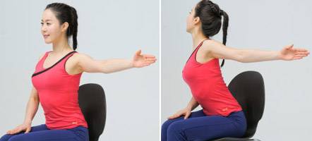 1. 팔꿈치가 구부러지지 않도록 팔을 옆으로 쭉 편다.(왼쪽 사진)