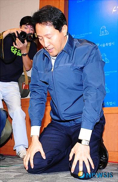 【서울=뉴시스】전신 기자 = 오세훈 서울시장이 21일 오전 서울시청 브리핑룸에서 무상급식 주민투표 결과에 따른 향후 거취에 관한 긴급 기자회견을 하던 중 무릎 꿇어 인사하고 있다.