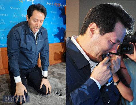 오 시장은 '시민 여러분께 충심으로 드리는 말씀'을 읽어 내려가던 중 갑자기 눈시울을 붉혔다. "번민 속에 이러한 결정을 내린 것은 이 나라가 인기 영합주의의 '빠른 복지'가 아닌 다음 세대, 그 다음 세대까지 배려하는 '바른 복지'의 시대로 나아갔으면 하는 절박한 심정, 그 한가지 때문"이라고 말한 뒤 눈물을 닦기 위해 뒤돌아섰다.