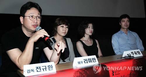 (서울=연합뉴스) 김연정 기자 = 24일 오후 서울 성동구 행당동 CGV 왕십리에서 열린 영화 '댄스타운'(감독 전규환) 시사회에서 전규환 감독(왼쪽부터), 배우 라미란, 주유랑, 오성태가 취재진의 질문에 답하고 있다. 한 여인의 처절하고 특별한 이야기를 다룬 영화 '댄스타운'은 여행자의 눈에 보이지 않는 도시의 외로움을 그려낸 '모차르트 타운'과 도시의 상처를 담아낸 '애니멀 타운'에 이은 타운 3부작 중 마지막 이야기이다. 2011.8.24
