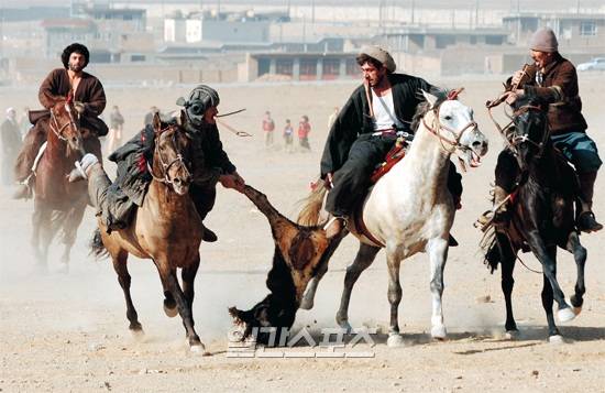 아프가니스탄에서 열린 부즈카시 경기에 출전한 선수들이 목 없는 양(가운데)을 차지하기 위해 힘겨루기를 하고 있다.