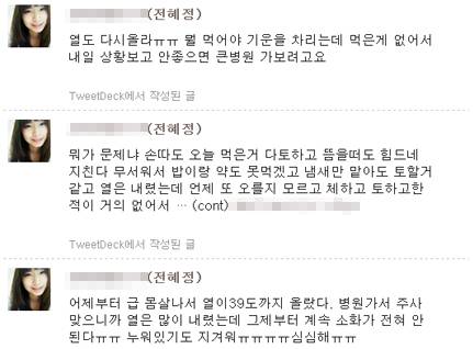 그러나 지난 밤 트위터를 통해 전해진 그녀의 근황은 여러 팬들의 가슴을 철렁하게 만들었다. 3일 전, 전격성 간염 판정을 받은 전혜정씨가 입원 치료 도중 상태가 급격히 나빠져 서울대학병원 중환자 실에 입원 중이며 간 이식 수술을 위해 가족을 중심으로 적합성 테스트를 받고 있으나 이마저도 여의치 않아 수술이 미뤄지고 있다는 소식이었다.