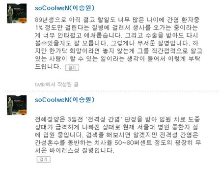 갑작스럽게 전격성 간염 판정을 받은 전혜정씨, 며칠 전에 남긴 트위터 멘션전격성 간염 판정을 받아 입원 중인 한 팬을 위해 e스포츠 팬들이 발 벗고 나섰다.