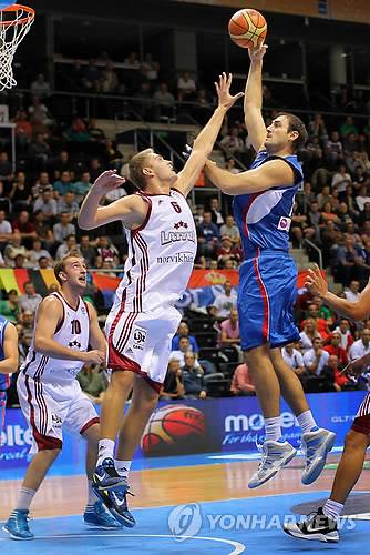 epa02891622 Latvia's Rolands Freimanis (C) and Rihards Kuksiks (L) try to block Serbia's Nenad Krstic (R) during the preliminary round match between Latvia and Serbia, at the EuroBasket 2011 in Siauliai, Lithuania, 01 September 2011. EPA/ROBERT GHEMENT < 모바일 애플리케이션 >< 포토 매거진 >< 저작권자(c)연합뉴스. 무단전재-재배포금지. >