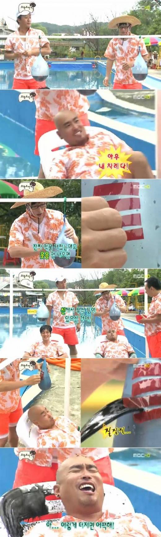 이날 소지섭-정준하, 유재석-길, 정형돈-하하, 박명수-노홍철이 각각 팀을 이뤄 오징어 먹물이 들은 풍선에 붙은 테이프를 떼는 게임을 펼쳤다.