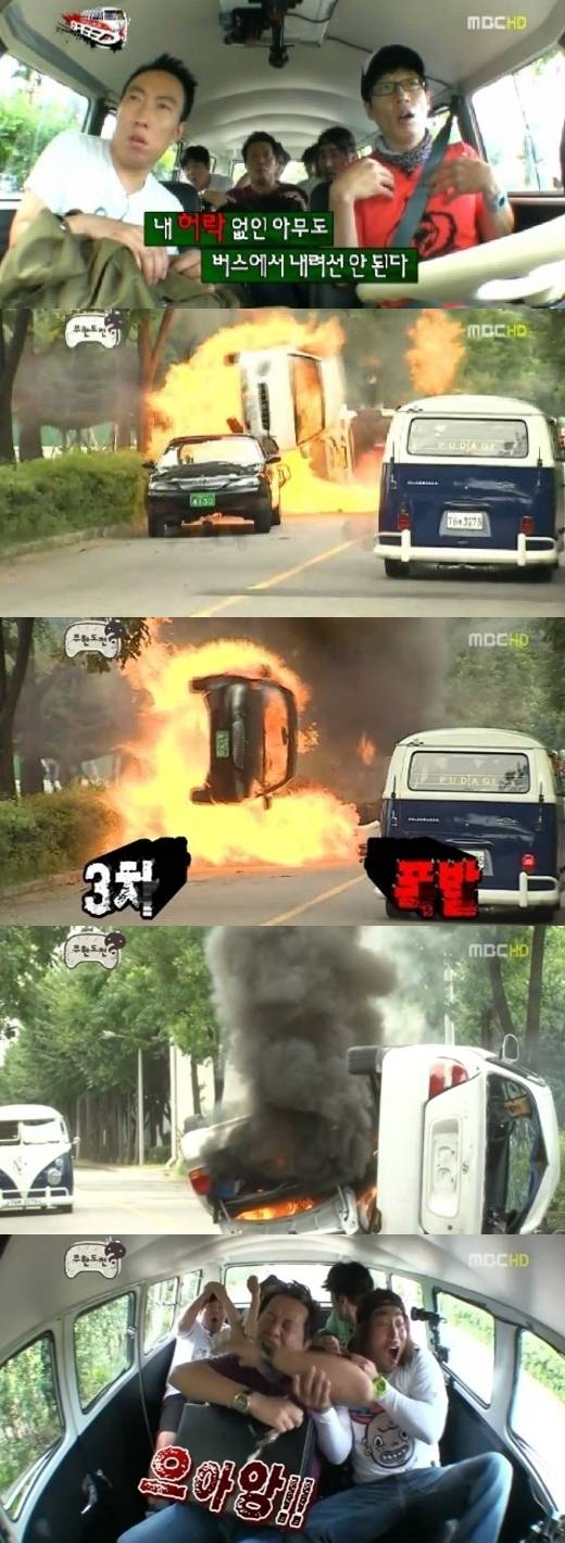 멤버들이 정준하의 가방을 열어 폭탄을 확인하자 버스 옆에 있던 승용차가 갑작스럽게 폭발했다. 이에 놀란 박명수가 마이크로 버스에서 내지라 의문의 목소리는 "박명수 빨리 버스에 타라"고 명령하며 또 한 대의 승용차를 폭파시켰다.