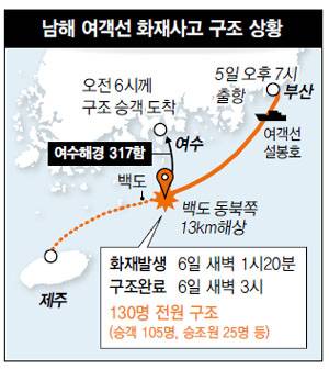 317함은 이날 아침 6시께 여수시 부두에 설봉호 승객들을 무사히 하선시켰다. 찰과상을 입은 승객 10여명만 병원에서 치료받았고, 나머지 승객들은 이날 오후 부산으로 돌아갔다. 해경은 설봉호 화물칸에서 처음 불길이 치솟았다는 진술을 확보하고 승조원 등을 상대로 불이 난 경위를 조사하고 있다. 광주/정대하 기자 daeha@hani.co.kr