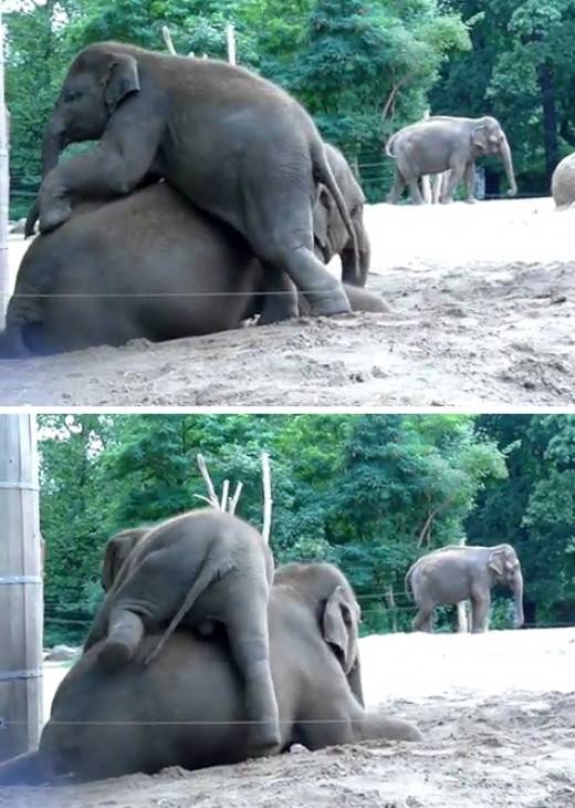 마치 엄마에게 어부바를 해달라고 떼를 쓰고 있는 모습이다. 하지만 엄마 코끼리는 이에 아랑곳 하지 않는다. 실패로 돌아가자 새끼는 엄마에게 소심하게 뒷발질로 가격했다.