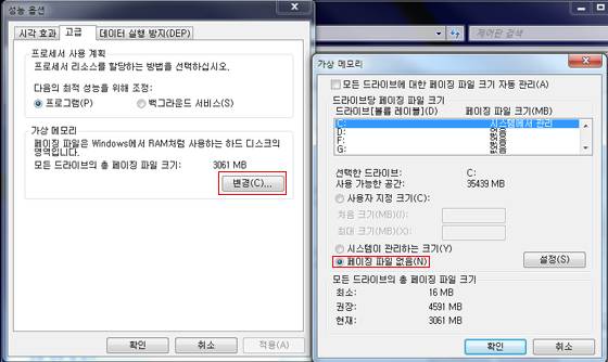 여기서 '모든 드라이브에 대한 페이징 파일 크기 자동 관리'를 해제하고, 'C:'(SSD)를 선택한 뒤 하단에 있는 '페이징 파일 없음'을 선택한다. 그리고 우측에 있는 설정버튼을 눌러주면 SSD에 할당된 가상 메모리 용량은 제거된다(다른 저장장치에 가상 메모리를 할당하려면 'D:'(HDD)를 선택한 뒤 '시스템이 관리하는 크기'를 선택하고 설정 버튼을 누르면 된다).