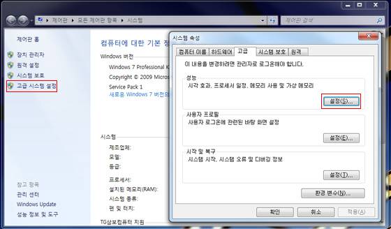 가상 메모리 용량을 다른 곳으로 변경하기 위한 순서는 다음과 같다. 우선 제어판에 위치한 '시스템'을 선택하거나 단축키인 '윈도우키+Pause break키'를 누르면 열리는 창에서 좌측에 위치한 '고급 시스템 설정'을 선택하고, 고급 탭에 위치한 '성능 설정'을 선택하면 가상 메모리 영역을 변경할 수 있는 창이 뜬다.