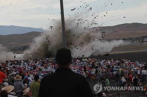 (AP=연합뉴스) 지난 16일(현지시각) 미국 네바다 주 리노에서 열린 에어쇼에 참가한 P-51 머스탱 비행기가 관중석 가장자리로 추락하면서 파편이 튀고 있다. P-51 머스탱은 제2차 세계대전 때 투입됐던 첫 미군 전투기이며, 이번 사고로 조종사 지미 리워드(74)를 포함해 9명이 숨졌다.