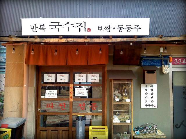 [중앙일보] 20평 남짓한 강남구 신사동의 만복국수전문점. 멸치국수와 비빔국수를 주 메뉴로 보쌈과 주먹밥이 곁들여져 판매하고 있다. 국수 자체는 4000~4500원 정도지만 주먹밥과 보쌈 패키지로 5, ~6000원이면 배불리 먹을 수 있어 점심시간이면 주변 직장인들이 줄을 선다.