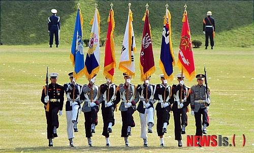 【계룡=뉴시스】홍성후 기자 = 1일 계룡대 연병장에서 열린 63주년 국군의 날 기념식에서 기수단 대원들이 정렬하고 있다.