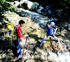↑ [월간산]흑범길로 접어들기 위해 설악골을 건너고 있다. 계곡 위쪽 바위가 흑범길 들머리를 상징한다. |