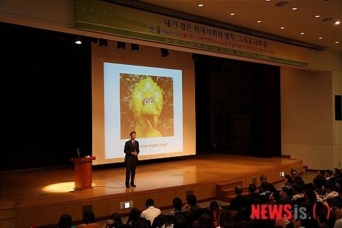【울산=뉴시스】유재형 기자 = 4일 울산과학대학(총장 이수동)은 동부캠퍼스 교내 대강당에서 아산정책연구연과 공동으로 미국 CBS 리얼리티쇼 '서바이버' 우승자인 권율(36)씨의 특강을 가졌다.