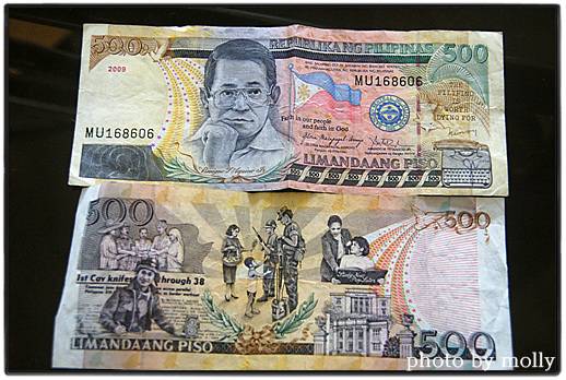 반 마르코스 열풍은 니노이 아키노의 부인인 코라손 아키노(필리핀 사람들은 '코리'라는 애칭으로 부릅니다)를 대통령으로 선출하였습니다. 대통령이 된 코리는 남편의 초상화가 실린 500페소짜리 지폐를 발행하였습니다. 한국 돈으로 1만2000원에 해당하는 고액권인 500페소짜리 지폐 뒷면에는 전투복 차림의 아키노와 그가 종군기자로 활약할 때 쓴 기사, '제1사단이 칼로 베듯 38선을 진격한다.(1st Cav knifes through 38)'와 함께 우리에게 익숙한 단어 'Korea', 'Seoul', 'Kaesong(g가 짤렸지만 개성)'도 찾을 수 있습니다. 그리고 중앙에는 그 당시 절박한 한국 실상을 반영하듯, 외국 군인들에게 '꽃 파는 한국 소녀, 구걸하는 한국 소년' 그림이 담겨 있습니다.