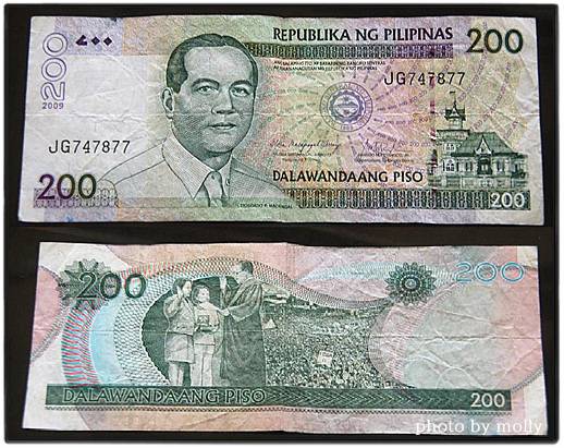 필리핀 대통령들의 지폐 사랑은 계속됩니다. 2001년 대통령에 취임한 글로리아 아로요는 이전에 없던 200페소짜리 지폐를 만들면서 앞면에는 자신의 아버지(이 아버지도 전 대통령이었습니다)의 초상을 넣고, 뒷면에는 자신이 대통령 취임식에서 선서하는 모습을 넣었습니다. 재임 중에 온 국민이 쓰는 지폐에 떡하니 자신의 모습을 넣는 대담함, 그 가치의 기준이 무엇인지 모르겠습니다. 게다가 100페소나 500페소와 달리 200페소짜리는 잘 쓰이지 않고, 다른 지폐에 비해 비정상적으로 크게 들어간 대통령 아버지의 초상화(업적이 없으니 배경도 횅합니다)를 볼 때마다 부담스럽습니다. 아버지에 대한 딸의 극진한 사랑과 자신의 모습을 화폐에 남기고 싶은 욕망이 탄생시킨 실용성 없는 화폐입니다.