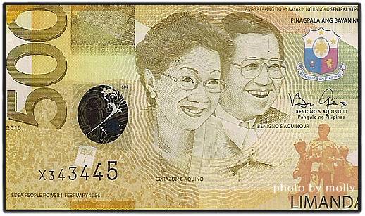 50대 노총각 노이노이 대통령의 최대 걸작은 500페소 지폐입니다. 부모님의 최대 업적인 피플파워 장면을 배경으로 아버지인 니노이 아키노와 함께 어머니인 코라손 아키노의 초상을 넣었습니다. 그 옆에 현 대통령인 아들의 친필 서명이 있습니다. 이로써 세계 최초로 세 명의 한 가족이 들어간 지폐가 탄생하였습니다. 뉴스에도 새로운 화폐를 받은 대통령이 웃음을 지으며 "세계 어느 나라에서도 두 부모와 그의 아들이 한 지폐 안에 들어가 있는 것이 없을 것이다, 이것이 아들로서, 그리고 필리핀의 국민으로서 나를 기쁘게 한다. 이것은 우리들을 위한 그들의 희생과 국가에 대한 사랑을 증언하는 것이다"는 내용을 대서특필하였습니다. 필리핀 대통령의 대단한 지폐 사랑, 어쩌면 조만간 지금의 아키노 대통령의 초상이 떡 걸린 1000페소짜리 지폐를 보게 될지도 모르겠습니다.