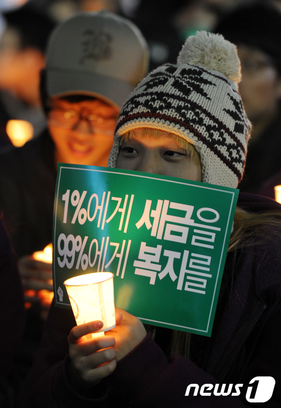 전 세계 80여개국 900개 이상 도시에서 동시다발적으로 '반(反)월가 시위'가 열린 15일 오후 서울 대한문 앞에서 '금융수탈 1% 저항하는 99%'라는 주제로 뜻을 같이하는 시민단체들과 시민들이 집회를 갖고 있다.