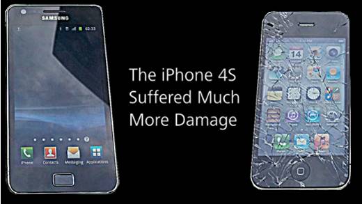 허리 높이에서 떨어뜨렸을 때, 아이폰4S은 모서리에 흠집이 생기고 뒷면의 아랫부분이 손상됐다. 반면, 갤럭시S2는 모서리 부분에 미세한 흠집이 생긴 것으로 그쳤다.
