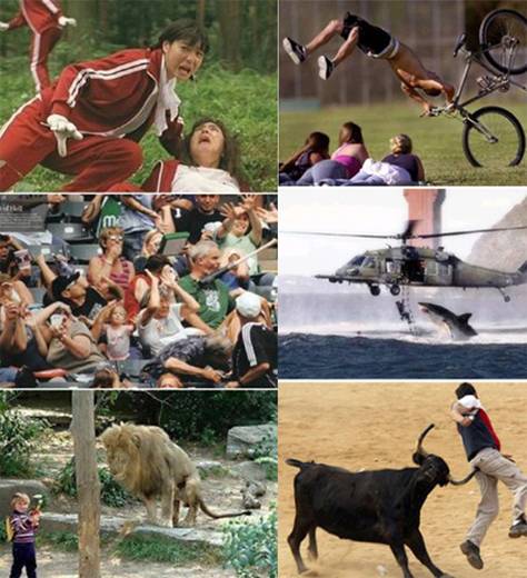 어린 아이의 바로 옆에 사자가 나타나고, 입 벌리고 있는 여성 위에 다른 한 여성이 흘린 콧물이 대롱대롱 매달려 있다. 또 자전거에서 넘어진 남성이 누워있는 여성들 위에 떠 있고 헬기로 구조되는 대원의 줄사다리 옆에 상어가 입을 벌리고 있는 등 다양한 상황이 순간 포착돼 있다.