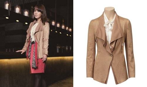 김정은이 멋스럽게 코디한 스웨이드 자켓은 지센(zishen) 제품으로, 안쪽에 니트를 패치했고, 자연스럽게 흐르듯 떨어지는 카라가 특징이다. 함께 코디한 스커트 역시 지센(zishen) 제품으로, 고급스러운 색상과 더불어 허리 배색으로 여성스러운 허리라인을 강조 할 수 있다.