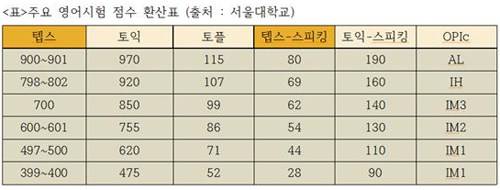 텝스 625점은 토익 몇점?..서울대, 영어점수 환산표 공개