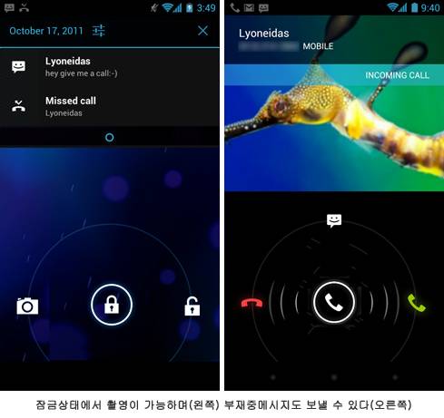 기존에는 잠금을 풀어야 사용할 수 있었던 일부 기능이 잠금 상태에서도 사용할 수 있게 변경됐다. 잠금 화면에서 카메라로 사진을 찍거나 메시지 알림창을 끌 수 있다. 음악을 들을 때는 음악 목록을 관리할 수도 있다. 또 부재중 메시지를 보낼 수 있는 기능도 추가됐다. 전화를 받기 힘든 상황에 전화가 걸려오면, 보낼 수 있는 메시지의 종류가 화면에 뜬다. 이 중 하나를 선택하면 상대방에게 문자메시지로 전송된다. 물론 '지금은 회의중이라 전화를 받을 수 없습니다' 등 자신이 미리 만들어놓은 메시지도 사용할 수 있다. 부재 중 메시지는 설정 메뉴에서 입력하면 된다.