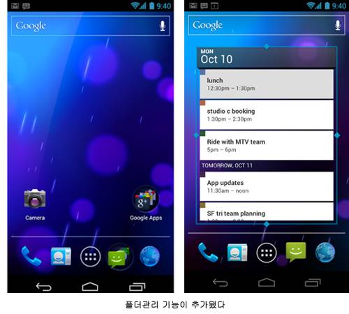 iOS에서 비슷한 어플끼리 묶을 수 있는 폴더관리 기능과 비슷한 기능도 추가됐다. 한 어플을 다른 어플로 끌어오면 폴더가 생성된다. 메뉴화면에서 폴더를 만드는 것은 물론 어플을 바로 삭제하거나 안보이게 만들 수도 있다. 하단의 즐겨찾기 목록(페이지를 넘겨도 고정되어 있는 기본 어플 목록)도 iOS처럼 사용자 입맛에 맞게 바꿀 수 있게 된다. 기존에 있던 어플을 밖으로 빼내고 새 어플이나 폴더를 집어넣을 수 있다. 위젯의 크기를 늘려서 더 잘 보이게 하거나 크기를 줄여서 공간을 확보하는 것도 할 수 있다.