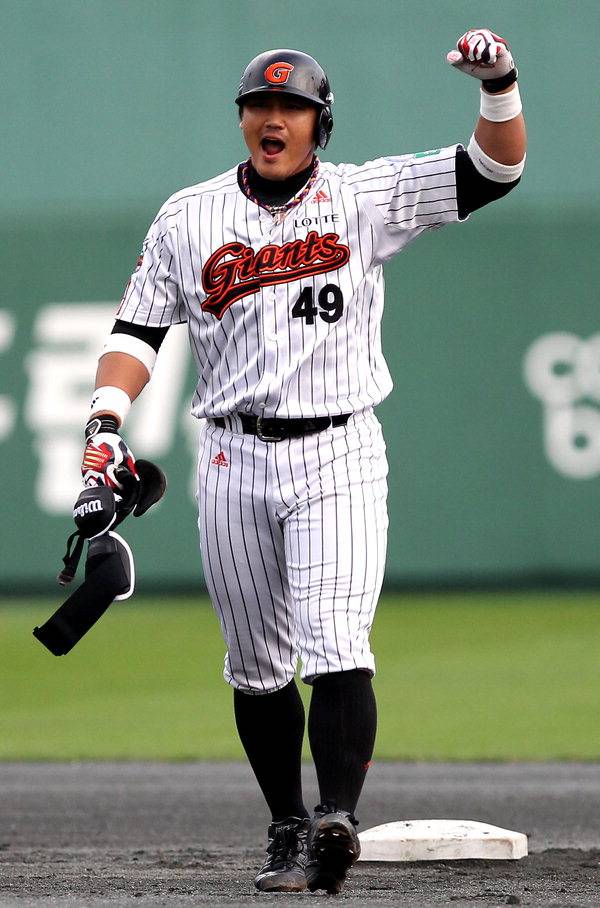 2011 프로야구 플레이오프 롯데와 SK의 5차전 경기가 23일 부산 사직야구장에서 열렸다. 6회말 무사 1,2루 롯데 홍성흔이 1타점 우중간 2루타를 치고 환호하고 있다.
