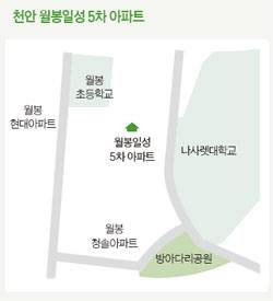 천안 쌍용동 월봉일성 5차 아파트에는 특별한 장소가 있다. 바로 단지 내 자리잡은 월봉초등학교다. 차도를 건널 필요가 없어 안전하고 주변환경이 깨끗해 학부모들에게 호응이 좋다. 단지 반경 1㎞내에는 쌍용중학교와 쌍용고등학교가 가까이 위치해 있다. 주민들이 입주한 지 10여 년이 흘렀지만 매물이 드문 이유기도 하다.