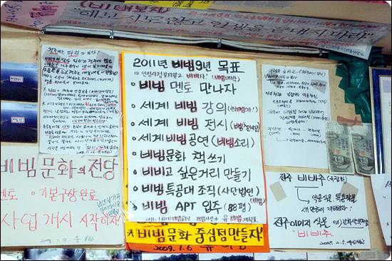 [[오마이뉴스 안소민 기자]전주에 '비빔'에 미친 사람이 있다. 전주 한국소리문화전당입구 건너편에 있는 음식점 '비빔소리'의 유비빔씨다. 지난 17일 유비빔씨를 만났다. 비빔씨는 원래 밴드활동을 했다. 그러던 중 2005년 스승에게 '소리'를 찾아야 한다는 가르침을 듣고 그 뒤로 세계소리축제에서 자원봉사를 했다. 어느 날 문득, 세상의 모든 소리가 '비빔'에서 시작된다는 생각이 번득 머리를 스쳤고, 그 후 그의 비빔철학은 시작됐다.