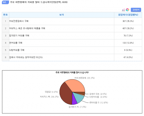 특히 커피믹스 혹은 유사형태의 제품으로 커피를 섭취(39.2%)의 뒤를 이어 커피전문점 이용(35.3%)의 빈도수가 높은 것으로 나타나 커피전문점의 시장성이 높은 것으로 분석된다. 그렇다면 가장 높은 점수를 받은 커피전문점은 어디일까.