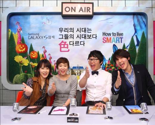 ▲ 지난 4일 삼성전자 양방향 방송 '보이는 HD 라디오 시대'에서 배우 최강희ㆍ류현경, '애정남(애매한 것을 정해주는 남자)' 코너의 최효종ㆍ류근지가 방송을 진행하고 있다. |