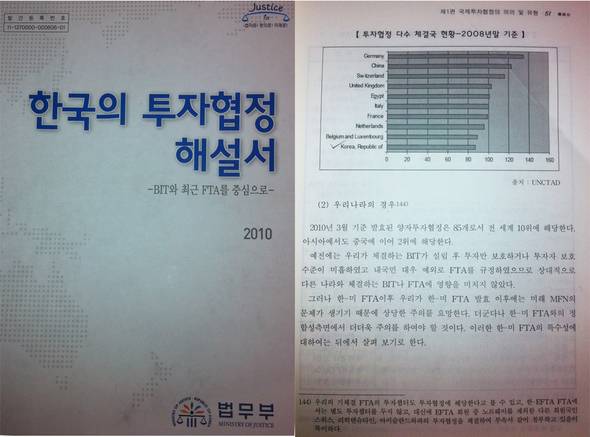 법무부가 지난해 10월 발간한 <한국의 투자협정 해설서>를 보면, 법무부는 "한-미 협정 발효 이후에는 미래 최혜국 대우(MFN)의 문제가 생기기 때문에 상당한 주의를 요망한다"며 "한-미 협정의 특수성"을 강조했다. 미래 최혜국 대우란 한-미 협정 발효 후 우리나라가 다른 나라와 좀더 유리한 혜택을 주는 투자협정을 맺을 경우 그 혜택을 미국 투자자에게 자동적으로 부여하는 제도다. 이 해설서는 한-미 협정을 기존에 우리나라가 맺은 투자협정과 각각 구체적으로 비교하며 설명한 것으로, 이귀남 당시 법무부 장관이 직접 발간사를 쓰기도 했다.