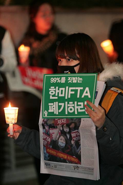 ▲ 지난달 27일, 여의도 국회 앞에서 열린 한미 FTA 반대 촛불집회. ⓒ허완 기자 |