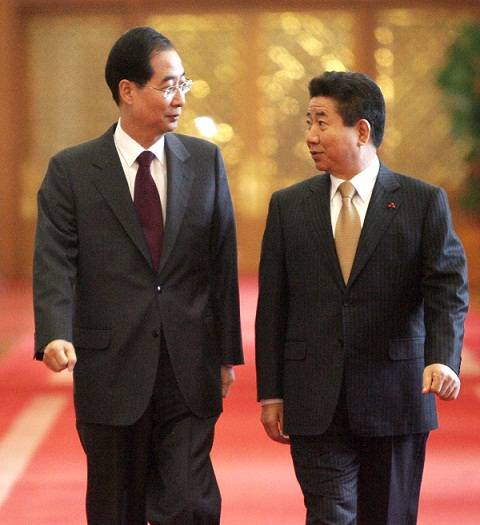 ▲ 2008년 1월 22일 오전, 노무현 전 대통령이 한덕수 당시 국무총리와 함께 국무회의장으로 들어서고 있다. ⓒ연합뉴스 |