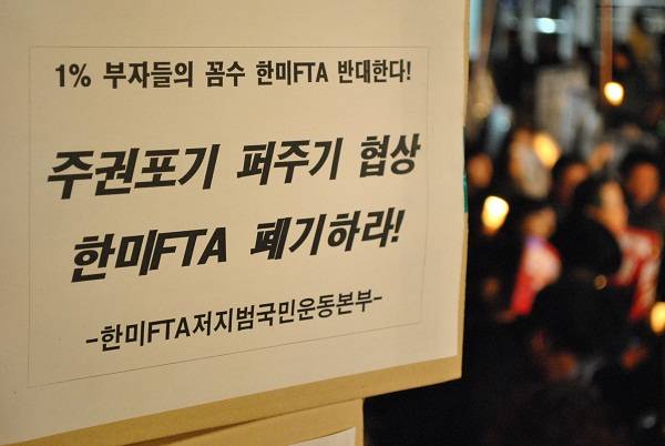 ▲ 지난달 27일, 여의도 국회 앞에서 열린 한미 FTA 반대 촛불집회. ⓒ허완 기자 |